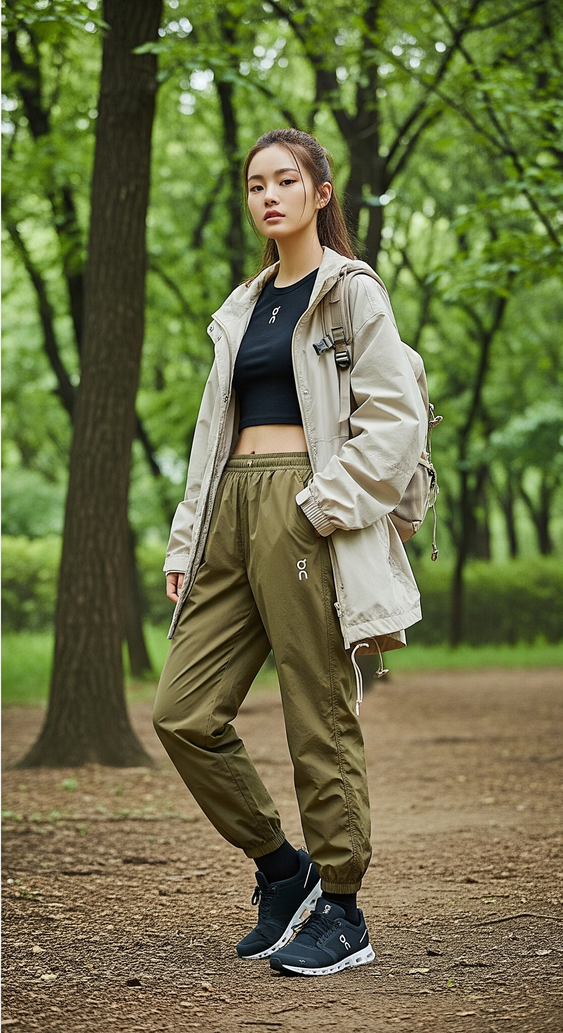 - 테크웨어 무드: 기능성 소재의 조거 팬츠, 바람막이 재킷 등과 온러닝 클라우드 벤처(Cloudventure)나 클라우드 고어텍스(Cloud X Waterproof) 모델을 매치하여 도회적인 테크웨어 룩을 완성.