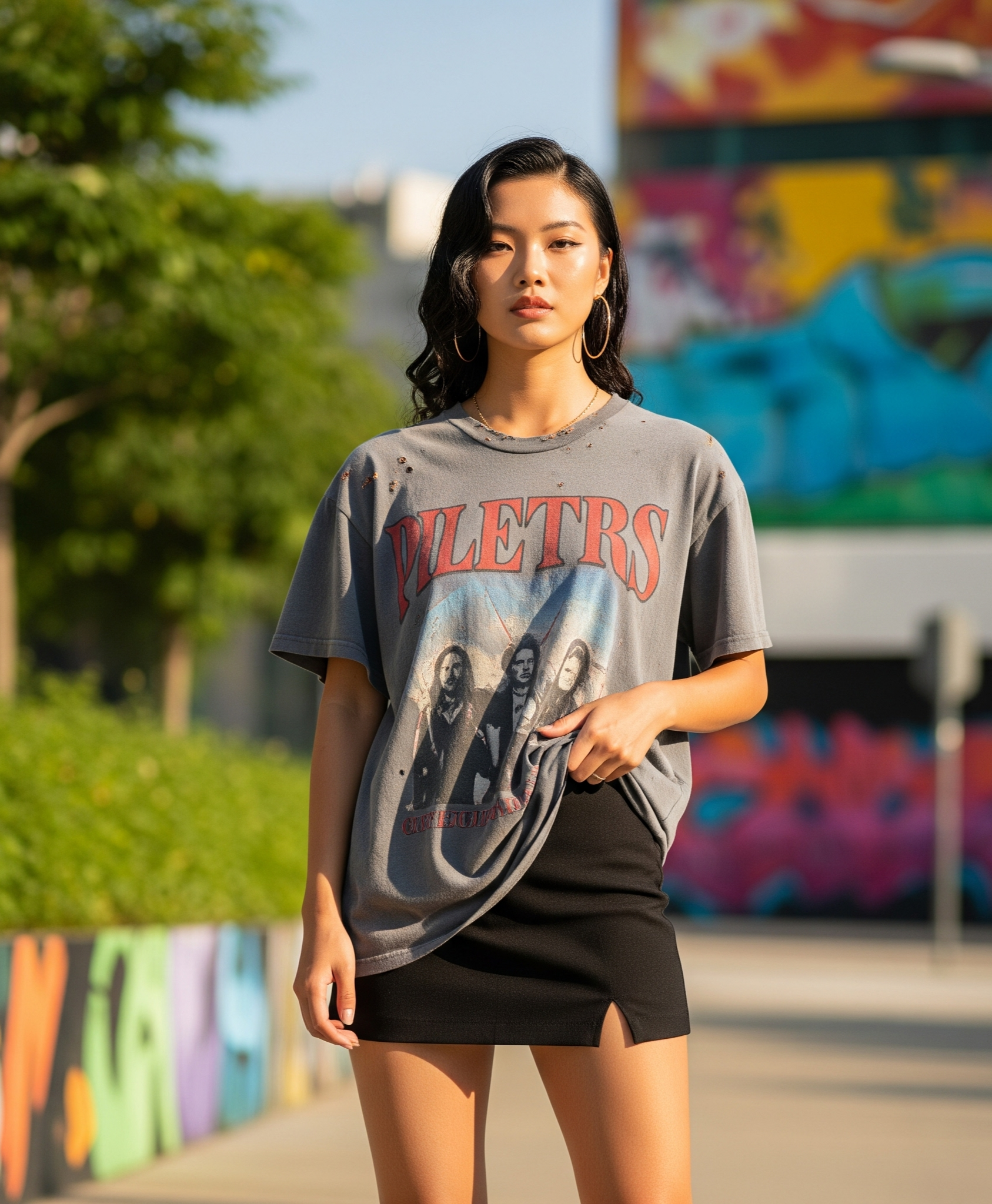 낡은 듯한 프린트와 색감이 매력적인 빈티지 밴드 티셔츠나 그래픽 티셔츠는 여름철 캐주얼 룩에 개성을 더해줍니다. 와이드 팬츠나 스커트와 함께 매치하여 힙한 무드를 연출해 보세요.