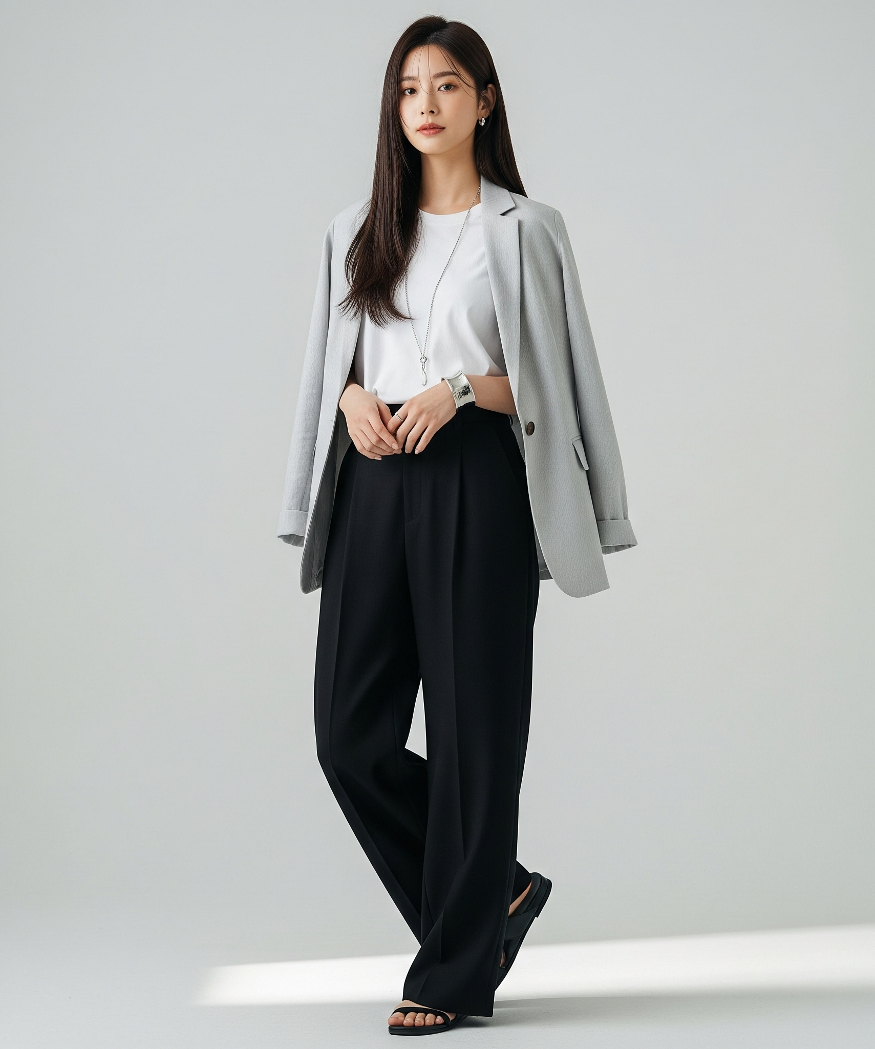 심플한 옷차림에 볼드하거나 구조적인 디자인의 주얼리, 미니멀한 가방, 또는 시크한 선글라스 등으로 포인트를 주면 밋밋함을 피할 수 있습니다.
