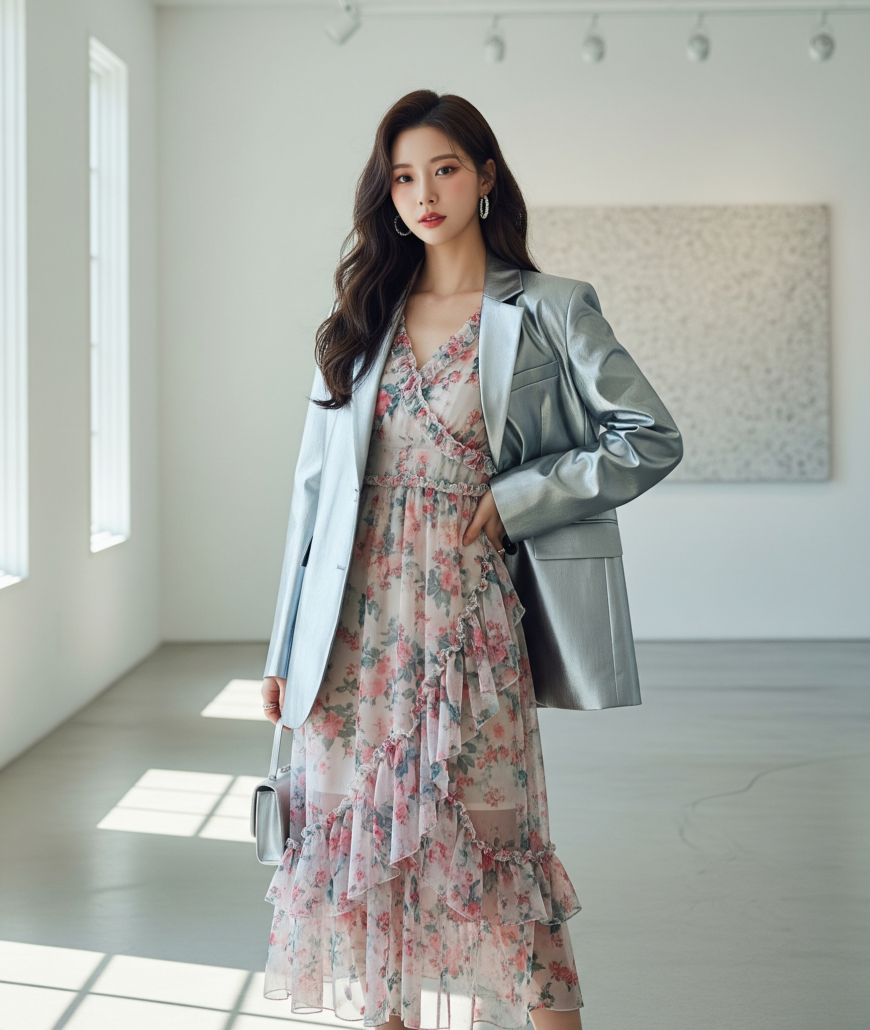 룩북이나 잡지 화보에서는 이러한 두 가지 트렌드를 함께 매치하여 미래지향적이면서도 낭만적인 분위기를 동시에 담아내는 콘셉트가 주를 이루고 있습니다. 예를 들어, 플로럴 패턴의 시어 드레스 위에 메탈릭한 실버 액세서리나 재킷을 매치하거나, 메탈릭 스커트에 은은한 플로럴 블라우스를 코디하는 방식이죠.