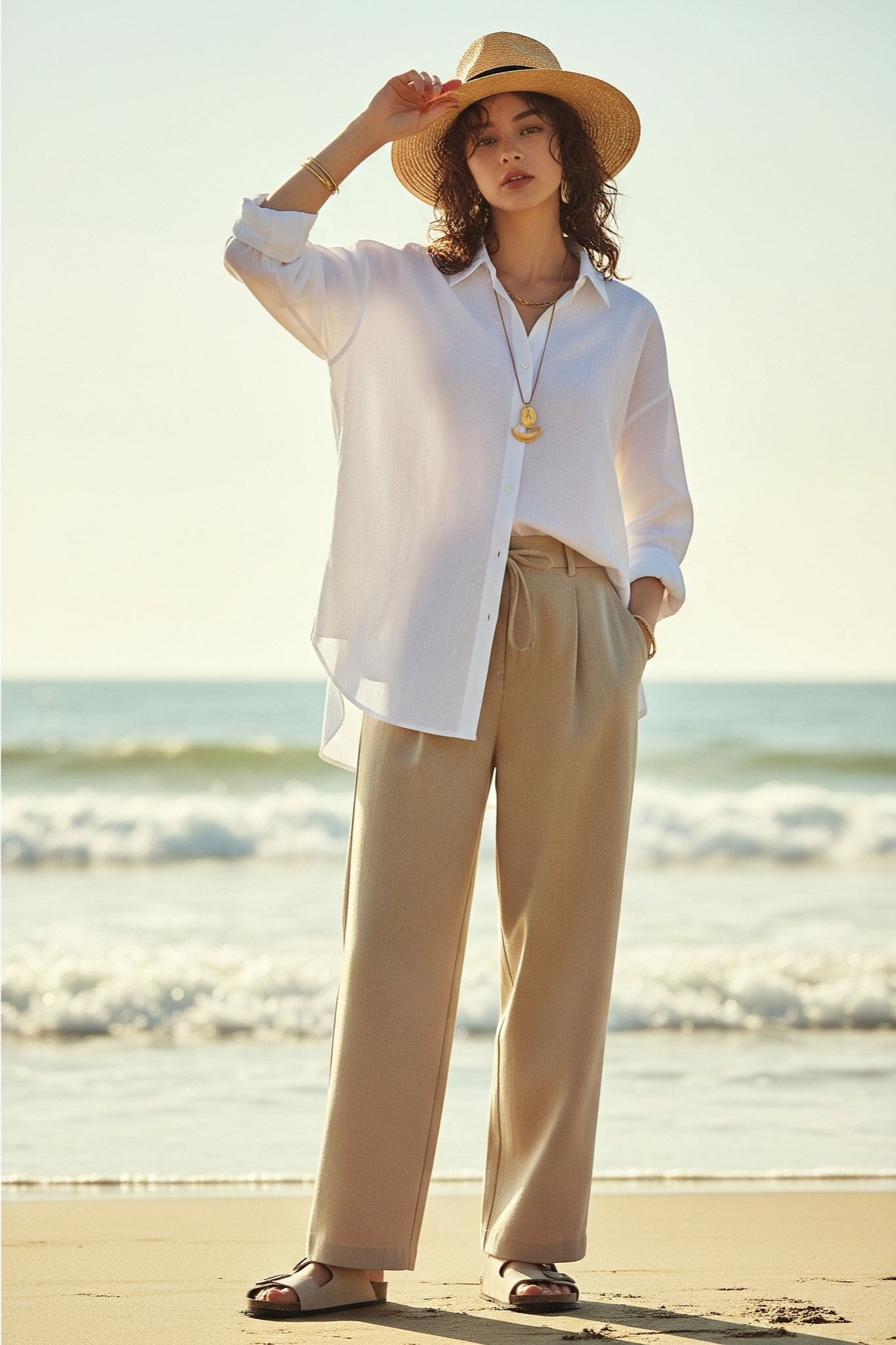 - 다용도 셔츠 활용: 얇은 린넨 셔츠나 면 셔츠는 햇빛을 가려주는 동시에 수영복 위에 가볍게 걸치기 좋아요. 크롭 기장의 셔츠는 하이웨이스트 팬츠와 매치하여 트렌디한 느낌을 줄 수 있습니다.